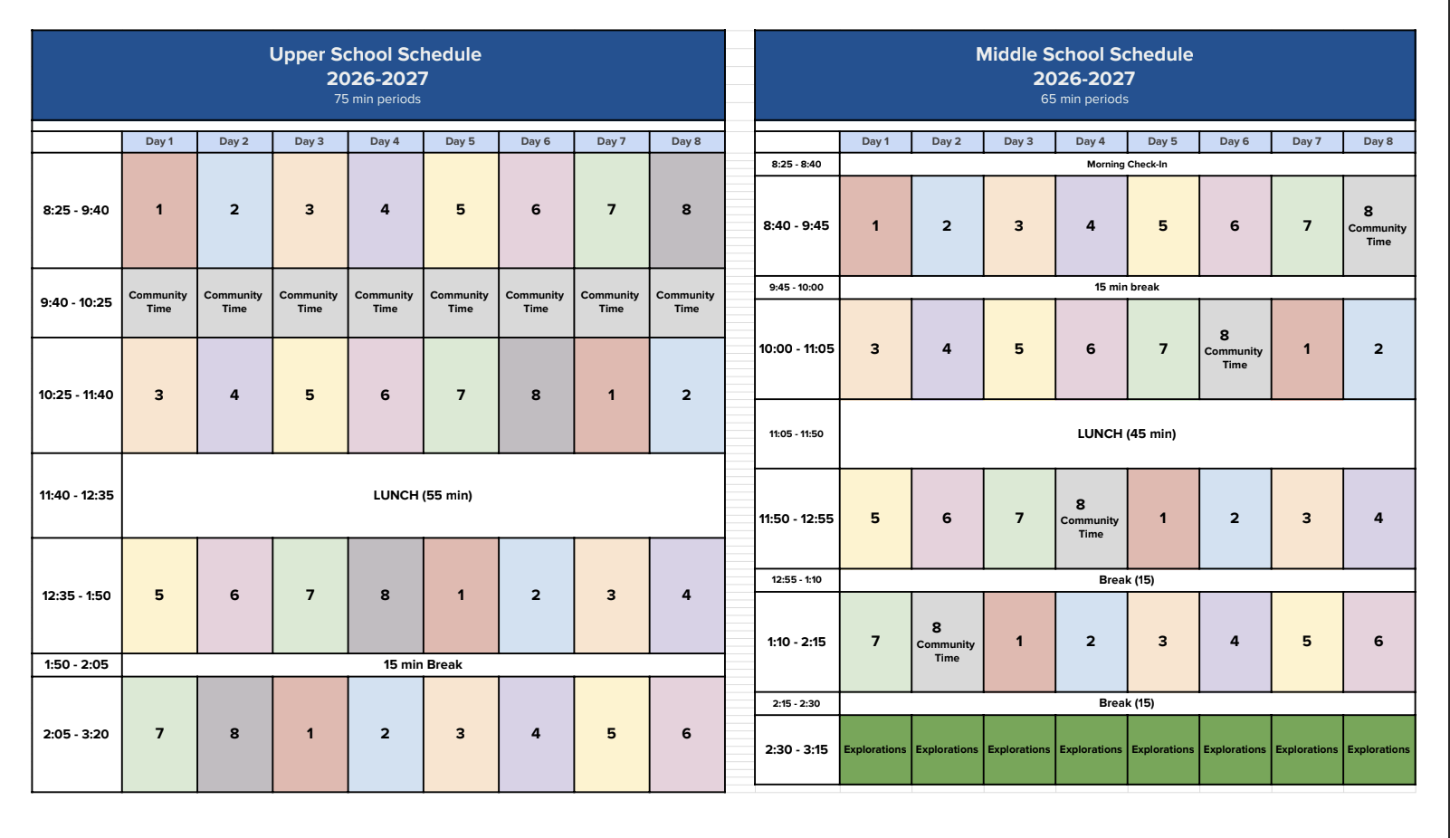 Over the past two years, the administration has been working on a major change to the Upper School schedule: shifting from the current 7-block, 5-day week to an 8-block rotation over 8 days. If adopted, the new schedule would give students more free periods, longer passing periods, a more consistent daily rhythm, and additional opportunities for electives, community time, and college counseling.